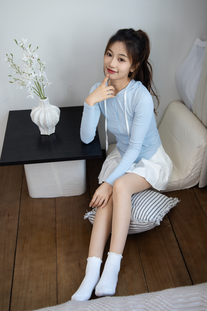 搭配内容:蓝色卫衣、白色短裙、麦昆鞋、肉色丝袜、白色棉袜