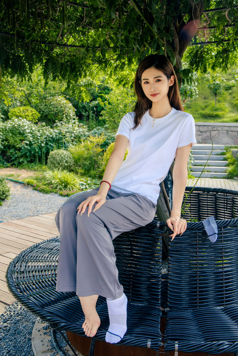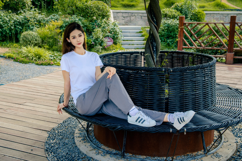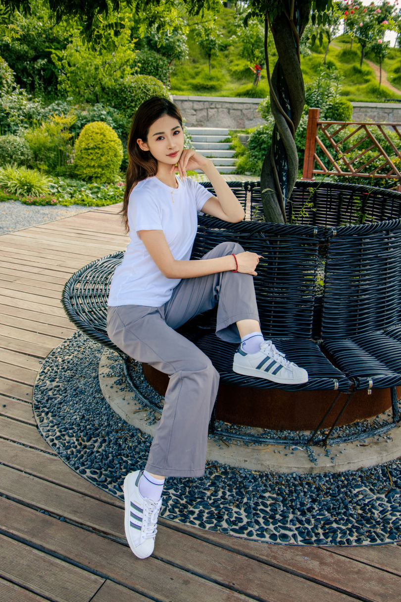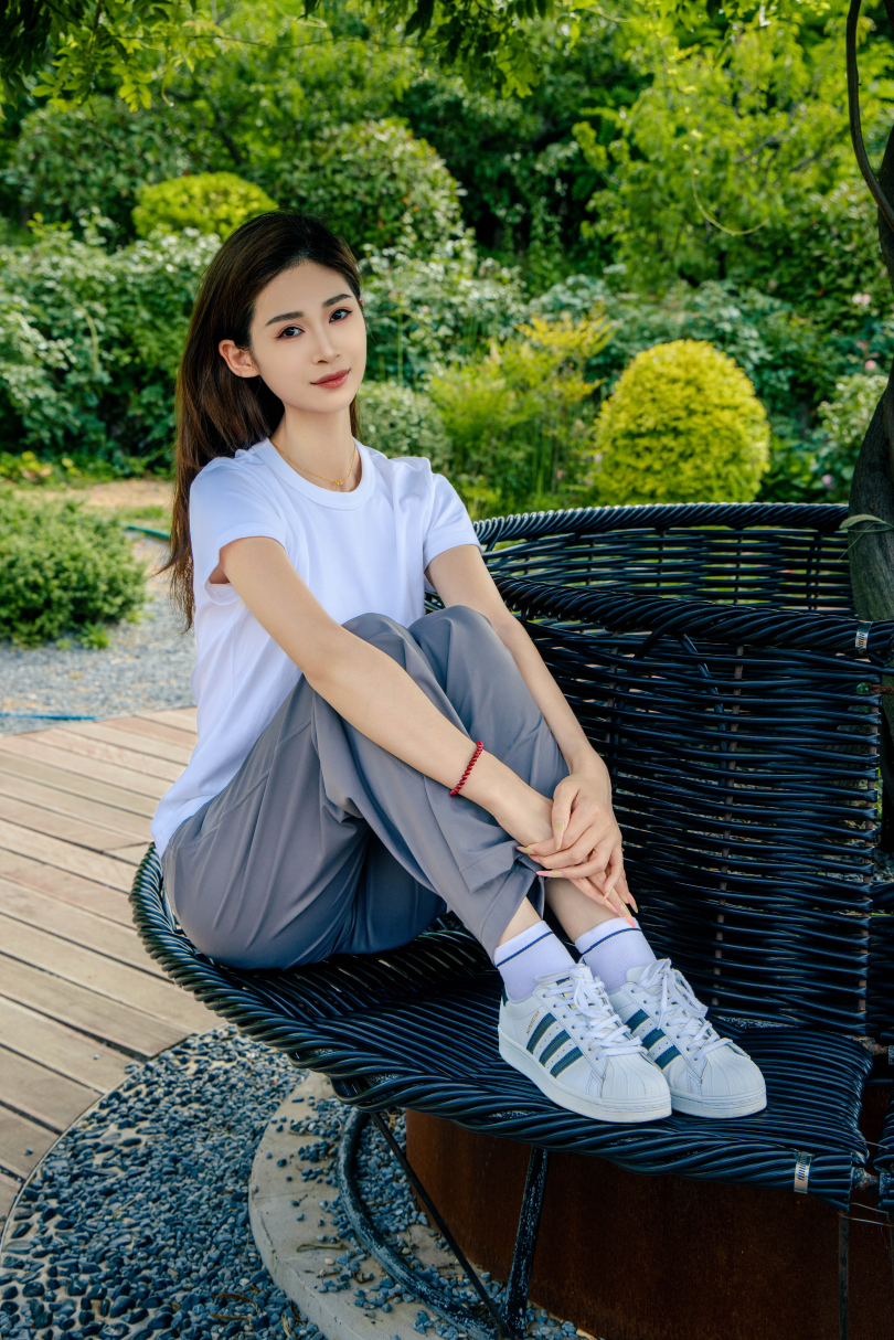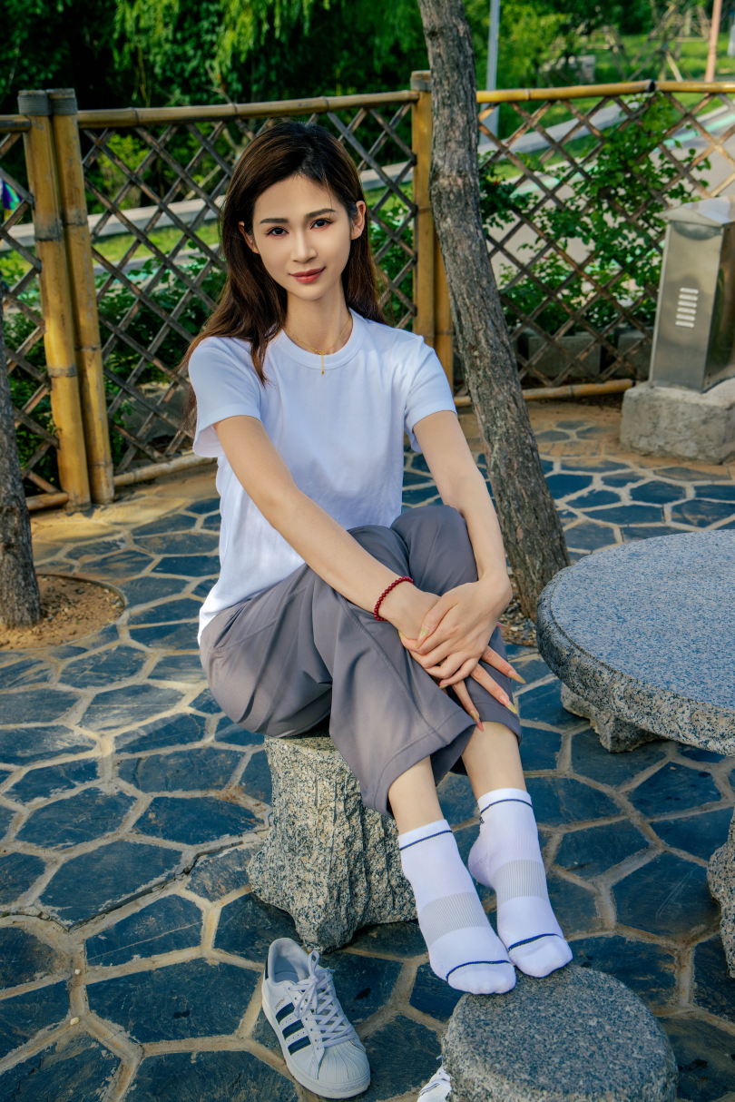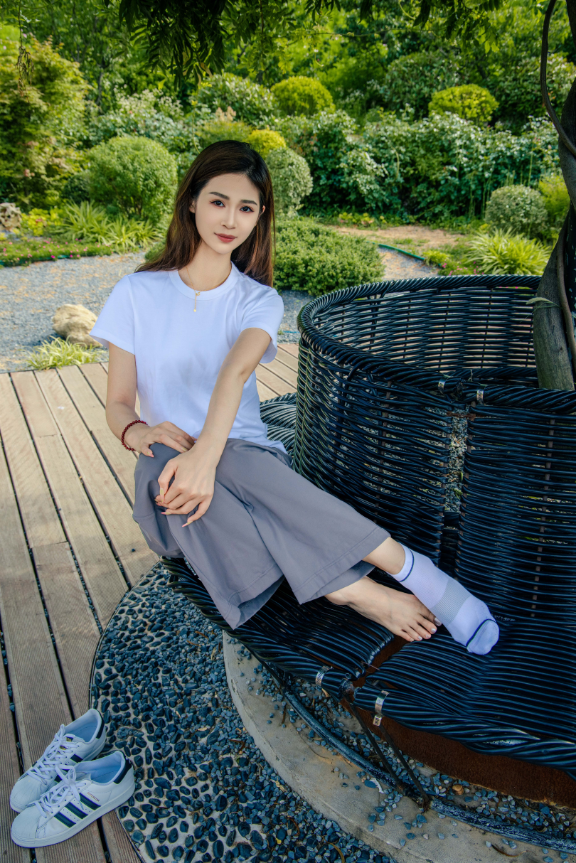 搭配内容:白T恤、灰色长裤、白色棉袜、贝壳头鞋