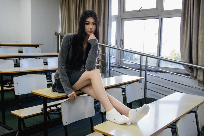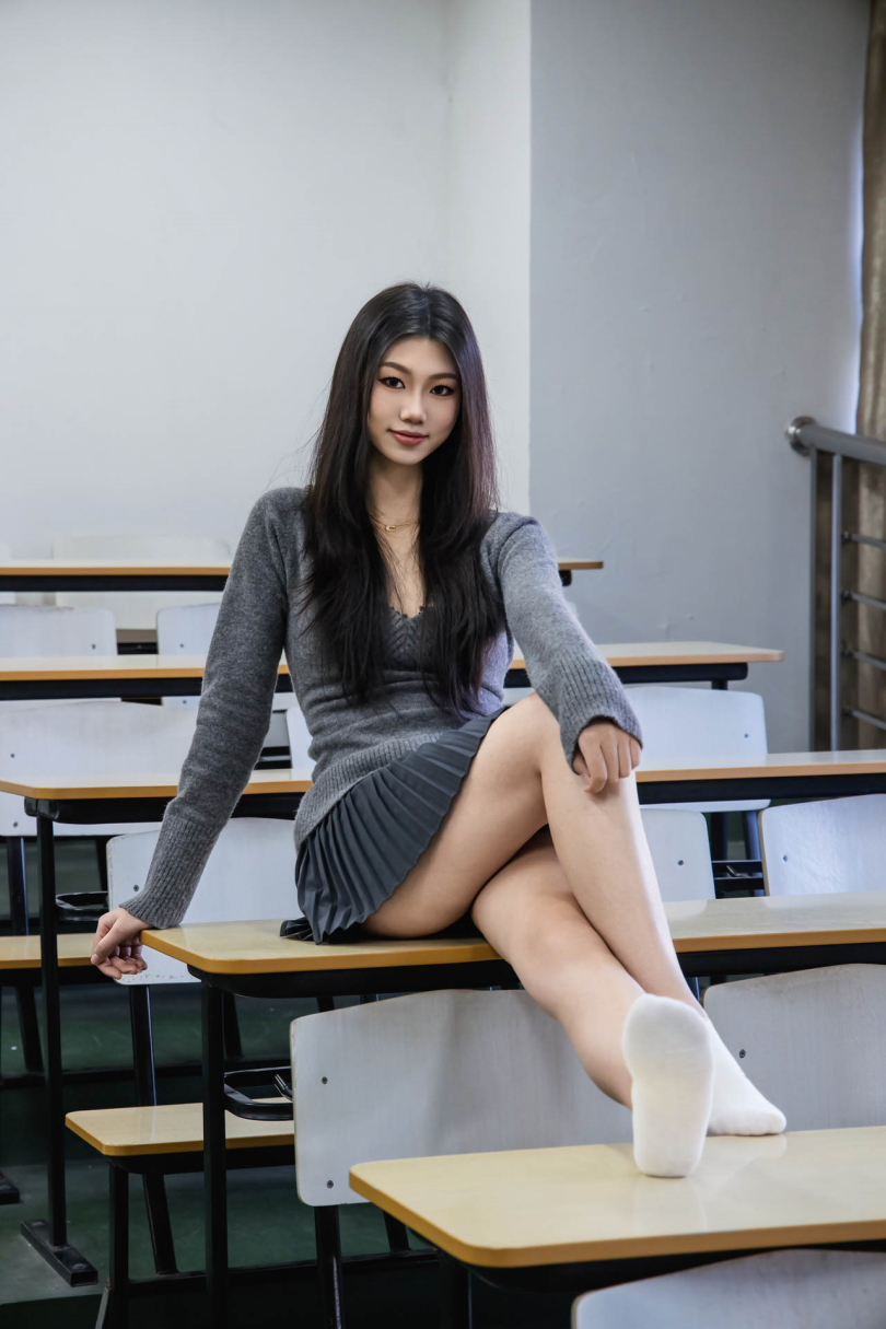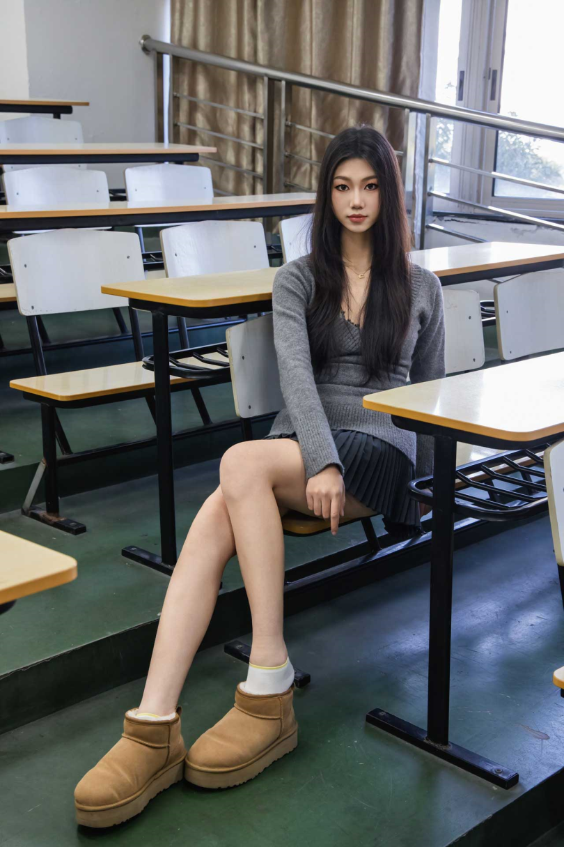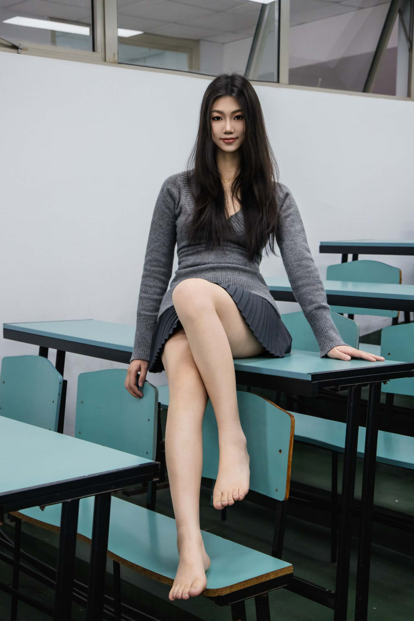 搭配内容:灰色毛衫、黑色短裙、松糕鞋、白色棉袜、裸足