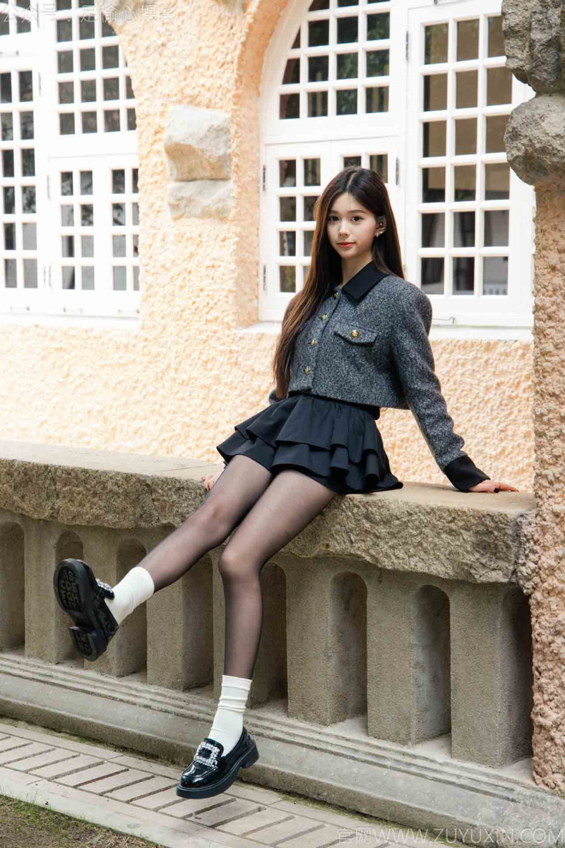 搭配内容:灰色外套、黑色短裙、黑色皮鞋、黑色丝袜、白色棉袜