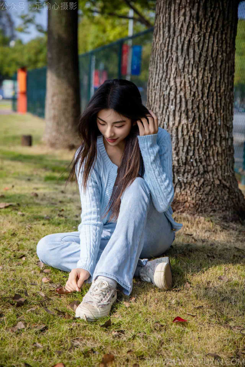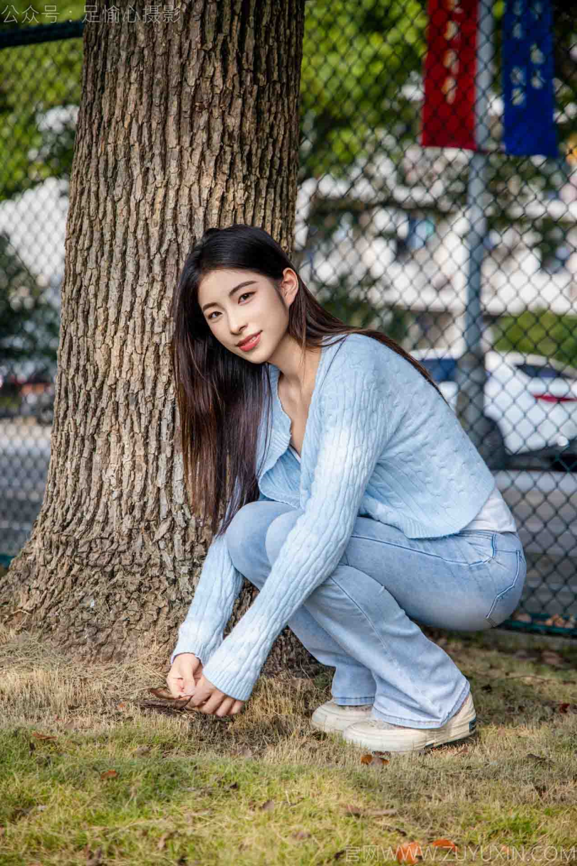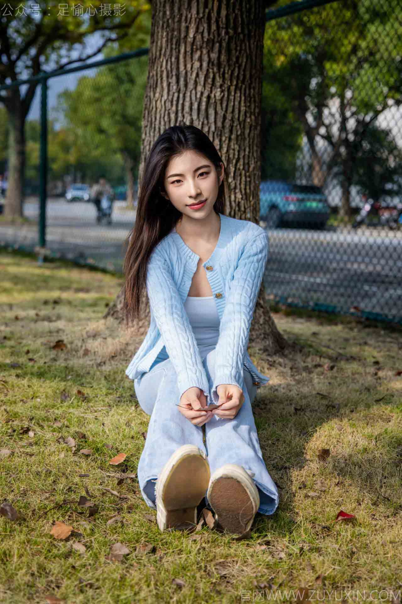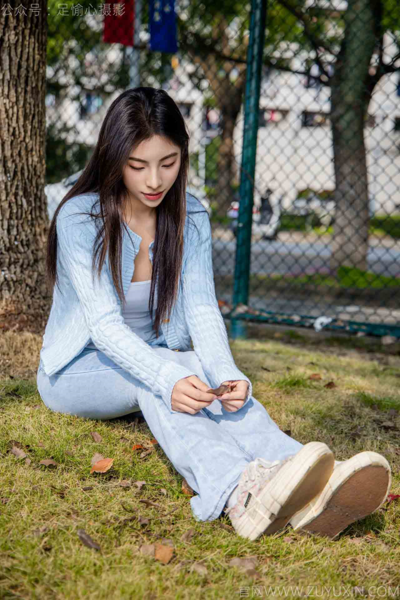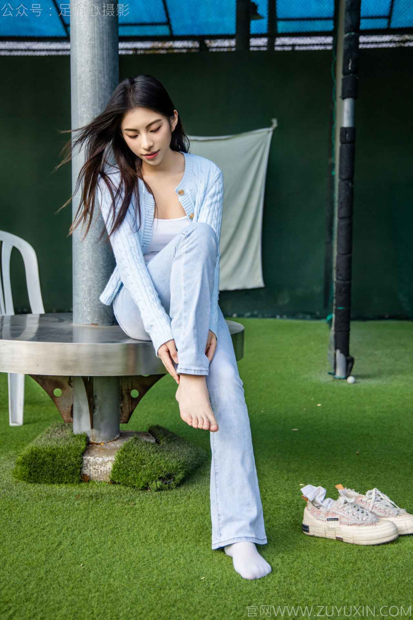 搭配内容:蓝色针织外套、蓝色抹胸、牛仔裤、帆布鞋、白棉袜、裸足
