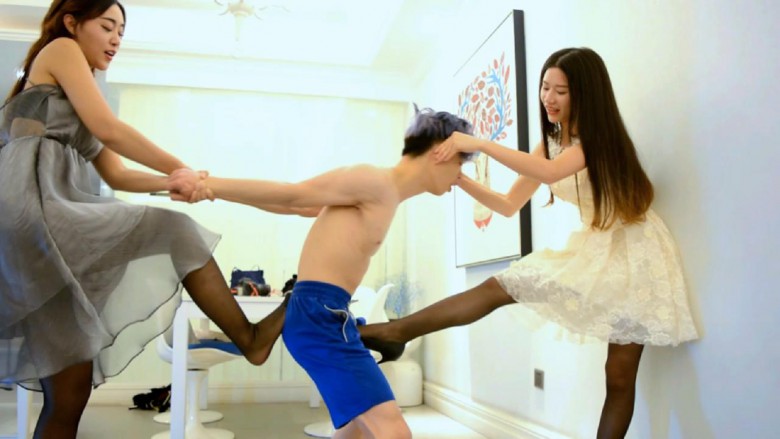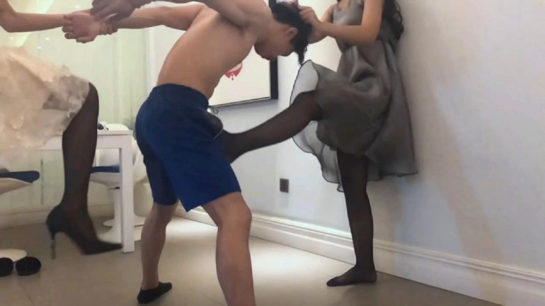 【内容简介】:两位女王把胖m逼到墙边,围着踢踹、踩踏,仿佛脚下只是个软绵绵的公仔;后来换了个瘦m,命令站直分开双腿,一前一后的控制着、轮流踢裆,m痛不欲生