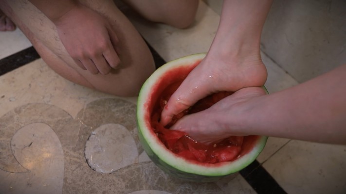 之后芷晴拿出半个西瓜,用脚踩碎西瓜并喂给m吃,接着往西瓜瓤里接满圣水,混合着洗脚的西瓜汁,强制灌进m的嘴里让他全部喝进肚子里...